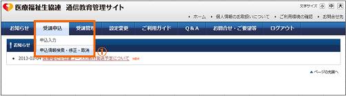 | 1. | ログイン後、トップ画面の「受講申込」→「申込情報検索・修正・取消」をクリックしてください。 | ||||||||||||||||||||