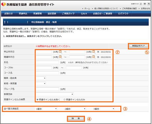 ① | 「受講申込」→「申込情報検索・修正・取消」をクリック | |||||||||||||||||||