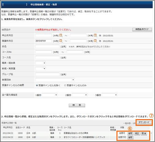 | 3. | 受講申込情報の一覧が表示されます。 個別に参照・修正・取消や検索した申込情報のダウンロードも行なうことができます。 |