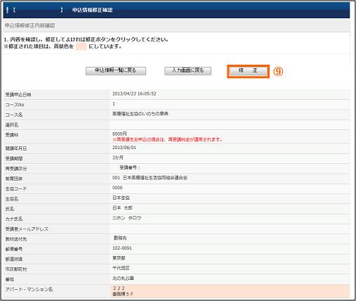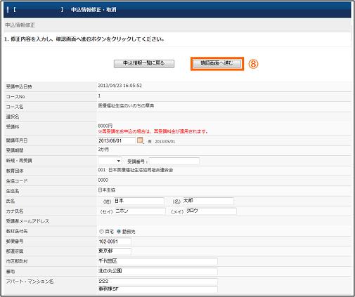 ⑧ | 修正内容を入力後「確認画面へ進む」をクリック ※本修正画面ではコース変更をすることはできません。コース変更する場合、取消後、再度、受講申込をしてください。 |