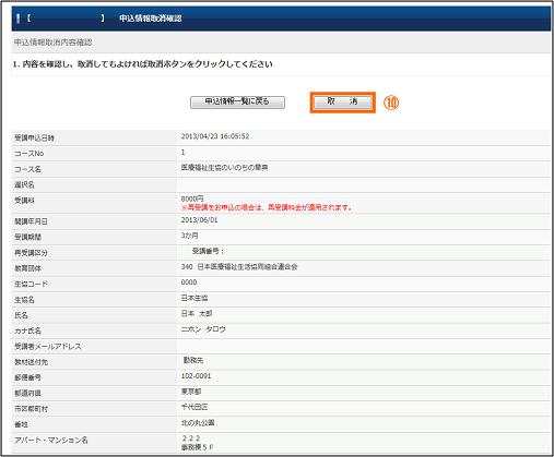 | 8. | 申込情報一覧から取消ボタンをクリックすると申込情報の取消画面が表示されます。 | ||||||||||||||||||||